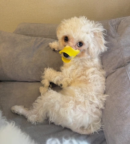 お出かけの時はいたずら防止のくちばし着けてアヒルちゃんになってもらっているのですが