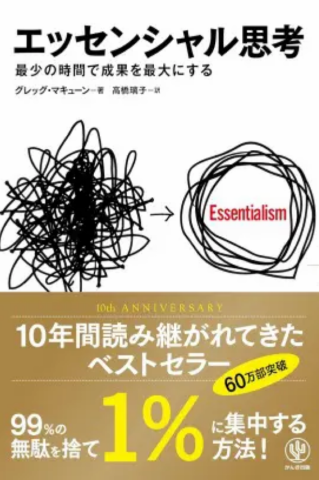 『エッセンシャル思考 最少の時間で成果を最大にする』は、2014年にかんき出版から発売された自己啓発本です。タイトルの「エッセンシャル思考」は、「99%の無駄を捨て、本当に必要な1%に集中する」という取捨選択の大切さを示しています。