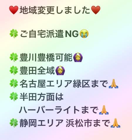 おはようございます 昨日お会いしていただいた お客様方! ありがとうございました メッセージしましたので またお手隙の時に見てくださいね タイトルのように そろそろ撮影したくって 私の得意の谷間を強調する服を 購入しました まだ届いてないから お店にはまだお願いしてない 秋冬に向けて長袖にしました で、谷間〜〜 まだ決まってないけど お楽しみに!! 決まってないけど 今日も11:00に三河安城に 行きます〜 他地域でスタート枠の方は 9:30くらいまでに 教えていただけたら 嬉しいです ![]() お休みの方も お仕事の方も 良い一日になりますように ♡ |