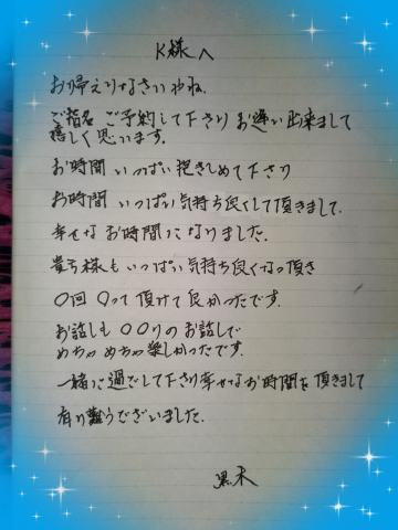 ちょっぴり、寒い夜 こんな時も 貴方様と一緒に過ごせた 余韻を感じながら… 心を、込めて 有り難うの、お手紙を… ![]() ![]() ![]() 皆様方に、お逢い出来ました事に ひとえに、感謝しております。 心から… スタッフ様、ドライバー様 有り難うございました。 ![]() ![]() おやすみなさい。 黒木 |
