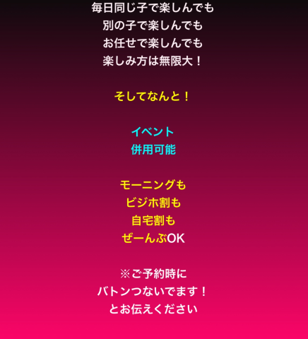 おふくろさん¨♡♡ 10月イベント♡ つなげ! おふくろのバトン♡*。 毎日おふくろさん♪ 80分コース以上で¨♡♡ 連続すればするほど 割引きがお得です♪ ![]() イベント併用可能です♡*。 ![]() ご予約の際には バトンつないでます! とスタッフさんに お伝え下さいね¨♡♡ 宜しくお願いします♡ ♡田代♡ |