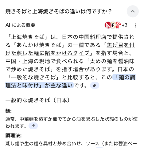 なるほどー 中国料理の上海焼きそばと 日本で食べるソース焼きそばとは 麺の調理方法と味付けが違うんですね 勉強になります