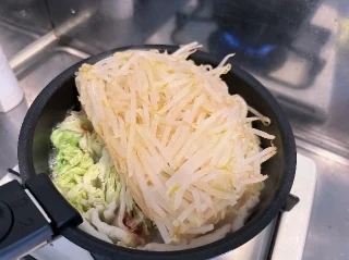(ミルフィーユ鍋に冷凍もやしを投入した図)