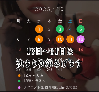 1日(水) 12時〜16時 3日(金) 18時〜23時 5日(日) 17時〜22時 8日(水) 12時〜16時 10日(金) 12時〜16時 11日(土) 12時〜17時 ![]() ※どの日も時間外は前日までにお店もしくはオキニトークへ問い合わせください 【オプションについて】 ・黄金(3日前までにご予約) ・疑似スカ(3つ以上の場合お知らせください) ・咀嚼(無料) ・嘔吐(休止中♡♡) 上記以外はその方に応じての カスタマイズなオプションに対応しておりますので、オキニトークやXへDMください♡ (@suzu___studioK) |