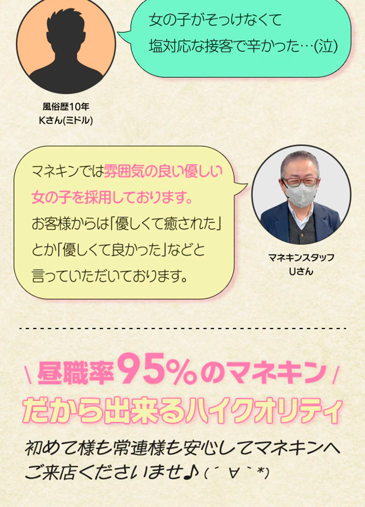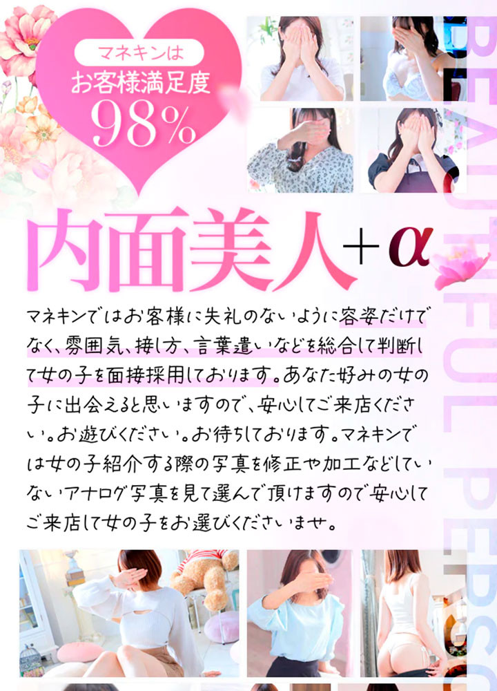 女の子あってのお店...だから女の子を大切にしています。マネキンのテーマは女の子に『稼いでもらう事』『喜んでもらう事』です。マネキンを気に入って頂けるように全力で頑張ります。