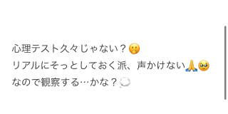 お題:【心理テスト答え】あなたの嫉妬度!声かける10%・SNSでつぶやく40%・写真撮る70%・観察90%に回答♪ |