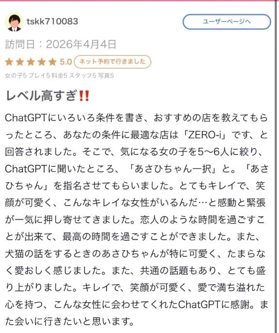 クチコミありがとうございますっ🥰チャッピーに相談は初めて聞いたけどおもしろいっっ🤣🤣🤣こんなに店舗があって、女の子もいて……すごい偶然で会えて☺️また… >>もっと詳しく見る