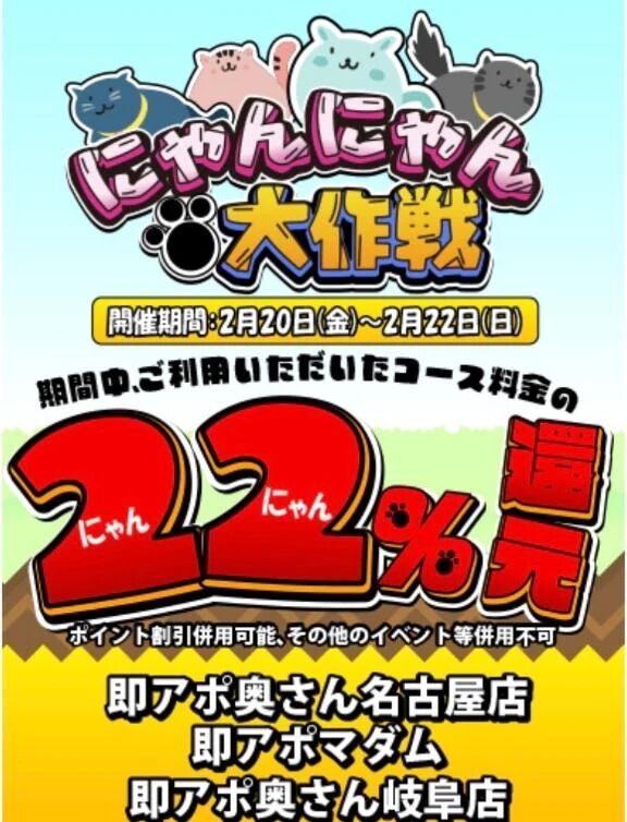 イベントしてるよ内容◆ポイント22%還元ポイント併用可能その他イベントとの併用は不可◆期間◆2/20(金)~2/22(日)◆対象店舗◆即アポ奥さん~岐阜店~ … >>もっと詳しく見る