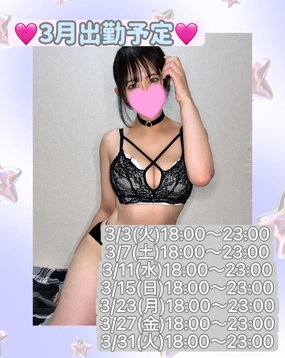 出勤日予定は♡♡3/3(火)18:00〜23:003/7(土)18:00〜23:003/11(水)18:00〜23:003/15(日)18:00〜23:003… >>もっと詳しく見る