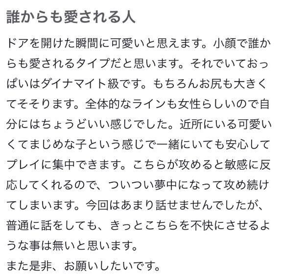 口コミありがとうございます((o(^∇^)o)) ドア開けてお兄さんの一言目がかわいいだったの嬉しかったよ💞 すごい積極的にきてくれてれいいっぱい感じちゃい… >>もっと詳しく見る