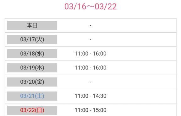 来週のシフト追加しました♡♡♡3/15(日)11時〜17時3/16(月)11時〜17時♡3/18(水)11時〜17時3/19(木)11時〜17時♡3/22(日… >>もっと詳しく見る